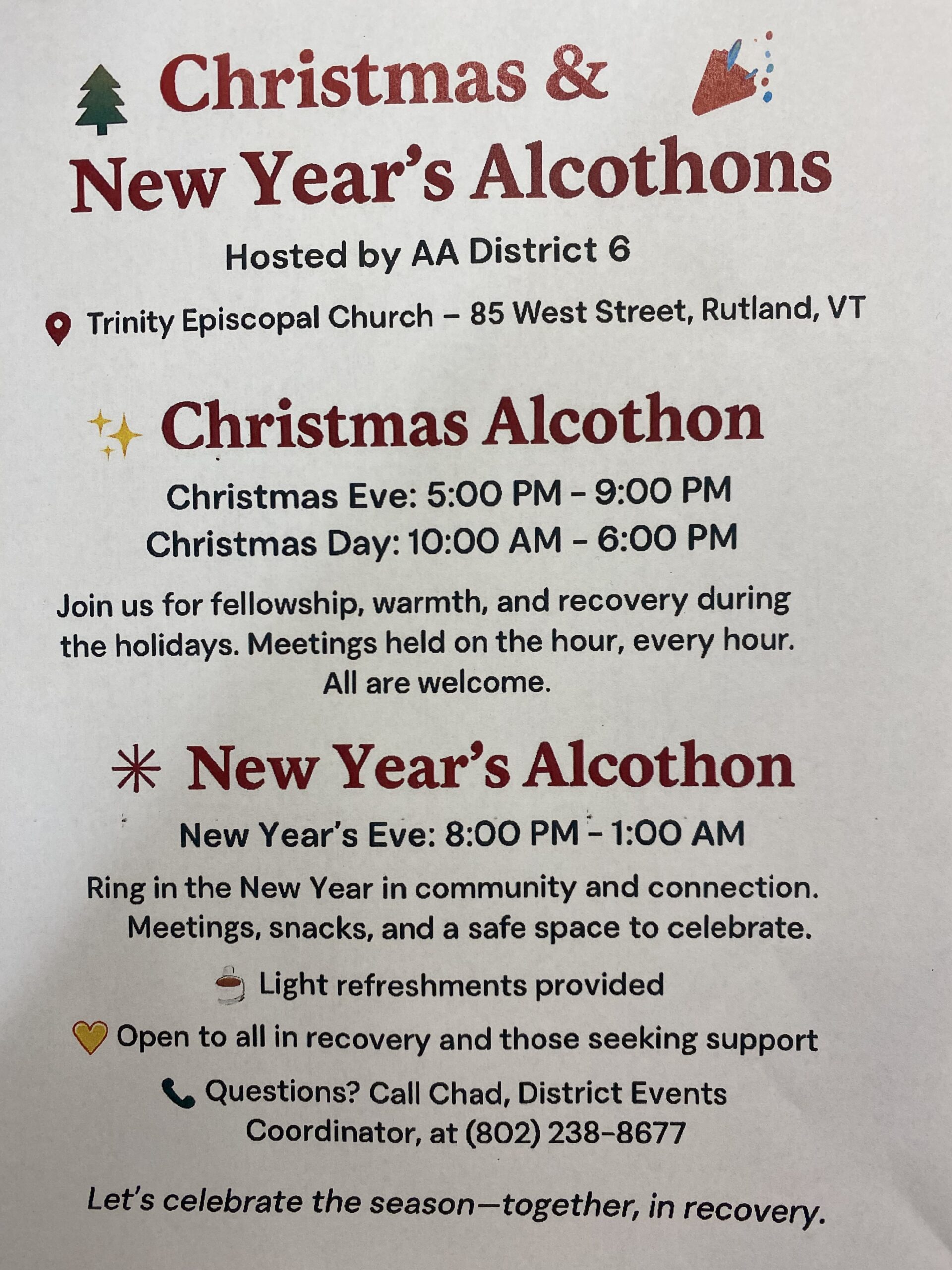The Christmas Alco-thon runs from Christmas Eve: first meeting starts at 5 pm and last meeting ends at 9 pm and Christmas Day: first meeting starts at 10 am and last meeting ends at 6 PM.