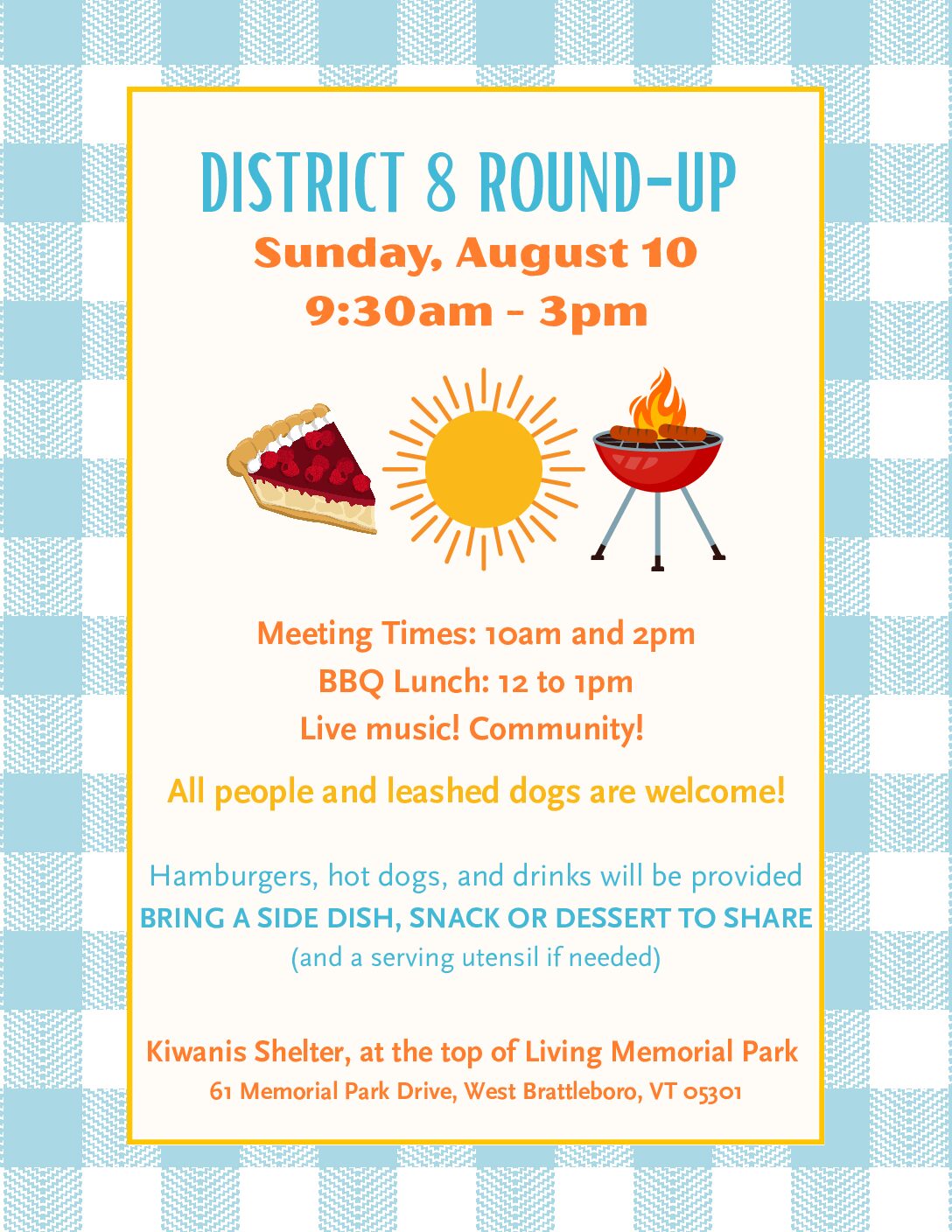 Aug 10 District 8 Round-Up 9:30 am - 3:00 pm Kiwanis Shelter at Living Memorial Park Memorial Park Drive, Brattleboro Event Details Get Directions